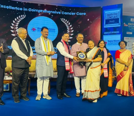 Bhagwan Mahaveer Cancer hospital has been awarded for its outstanding excellence in comprehensive cancer care on October 16, 2025. The award was presented by Dr. Premchand Bairwa, Hon’ble Deputy Chief Minister of Rajasthan, and Mr. Gajendra Singh Khimsar, Hon’ble Health Minister of Rajasthan to Mrs. Anila Kothari, Senior Vice Chairperson of BMCHRC at First India News Rajasthan.